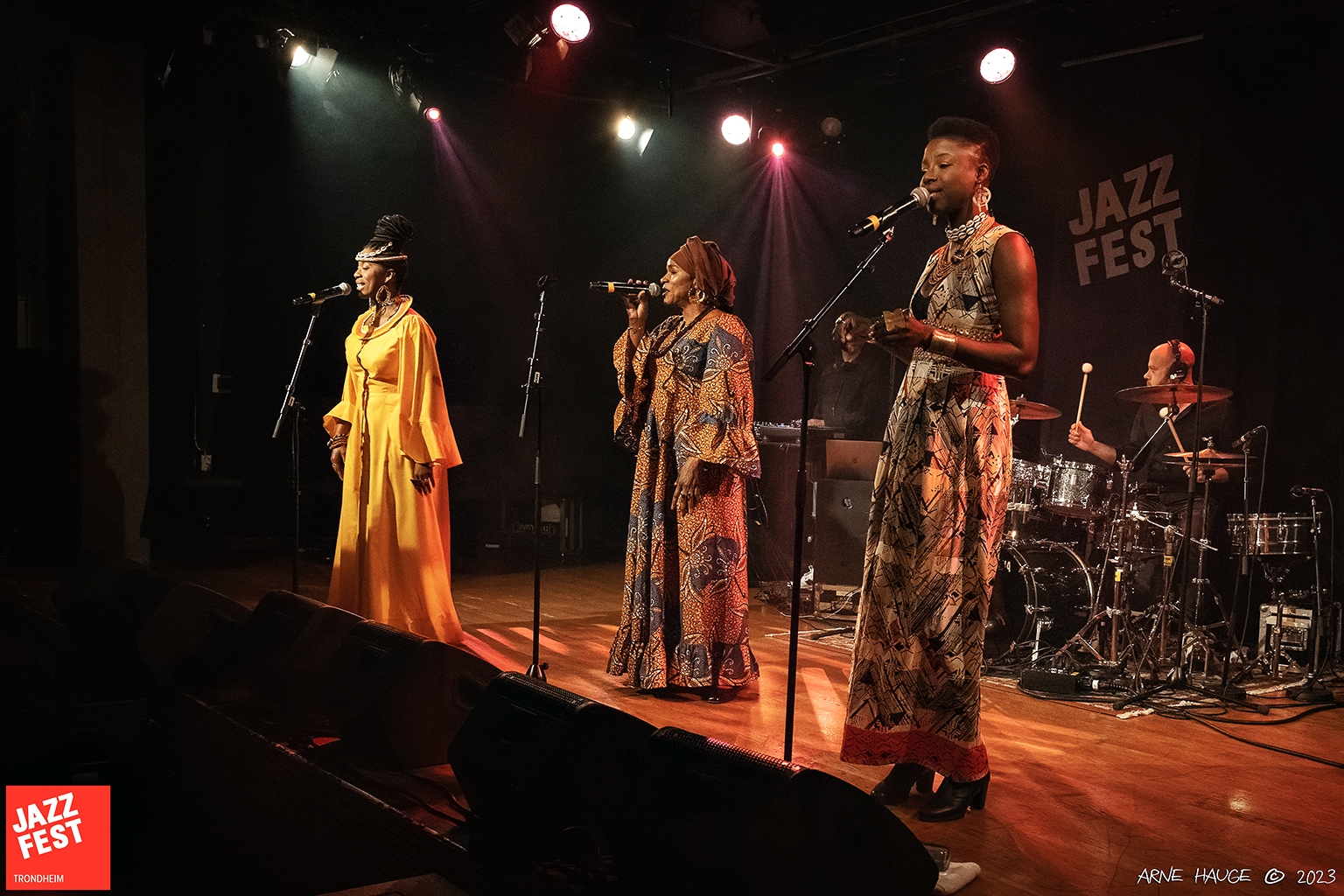 Endelig kommer kvinnene i Les Amazones D`Afrique på scenen i utrolig vakre og fargerike kostymer. DJ ́en starter et backtrack med delikate afrikanske trommelyder som groover fint. Trommeslageren tar på seg headset og spiller oppå backtracket. Det fungerer faktisk veldig bra. Kvinnene danser elegant og gitaristen begynner å spille «fills» på sitt eget gitar-riff. En av kvinnene begynner å synge og vi gjenkjenner umiddelbart at dette er musikk fra Mali. Landet som ligger inneklemt på vest kysten av Afrika på grensen mot Sahara, har en unik musikktradisjon med særegen klang og farge. De andre kvinnene synger flerstemt med på refrengene og det låter rett og slett nydelig. Publikum applauderer entusiastisk.